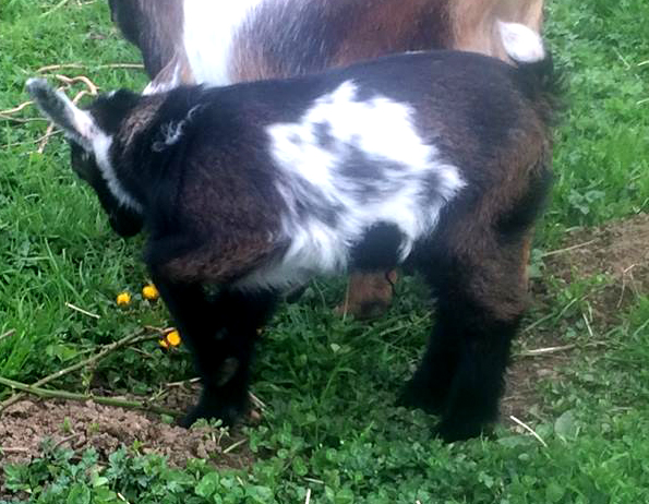 I tracked Buddy down for his polled gene, which is mostly an AGS pedigree, so that gene is really hard to follow. I'm considering it a separate line for now, tracing back to Donna's Domino. He has an interesting coat. To look at him now, you would think he is just black and white, but his kids really surprised me. I had two bucklings with a fever coat that looked like dark brown chamoise and his doeling had a couple of tiny moonspots! So I went back the photos of him as a buckling and sure enough, he had one whole ear that was a moonspot and he had that same brown chamoise fever coat. He sired five kids Spring 2019 and all but one had chocolate moonspots :) Granted, he was bred to a moonspotted doe, but the non-moonspotted doe threw two moonspotted kids, so Buddy DOES throw moonspots. I've retained his daughter Gavella Galactica to carry on his polled gene.