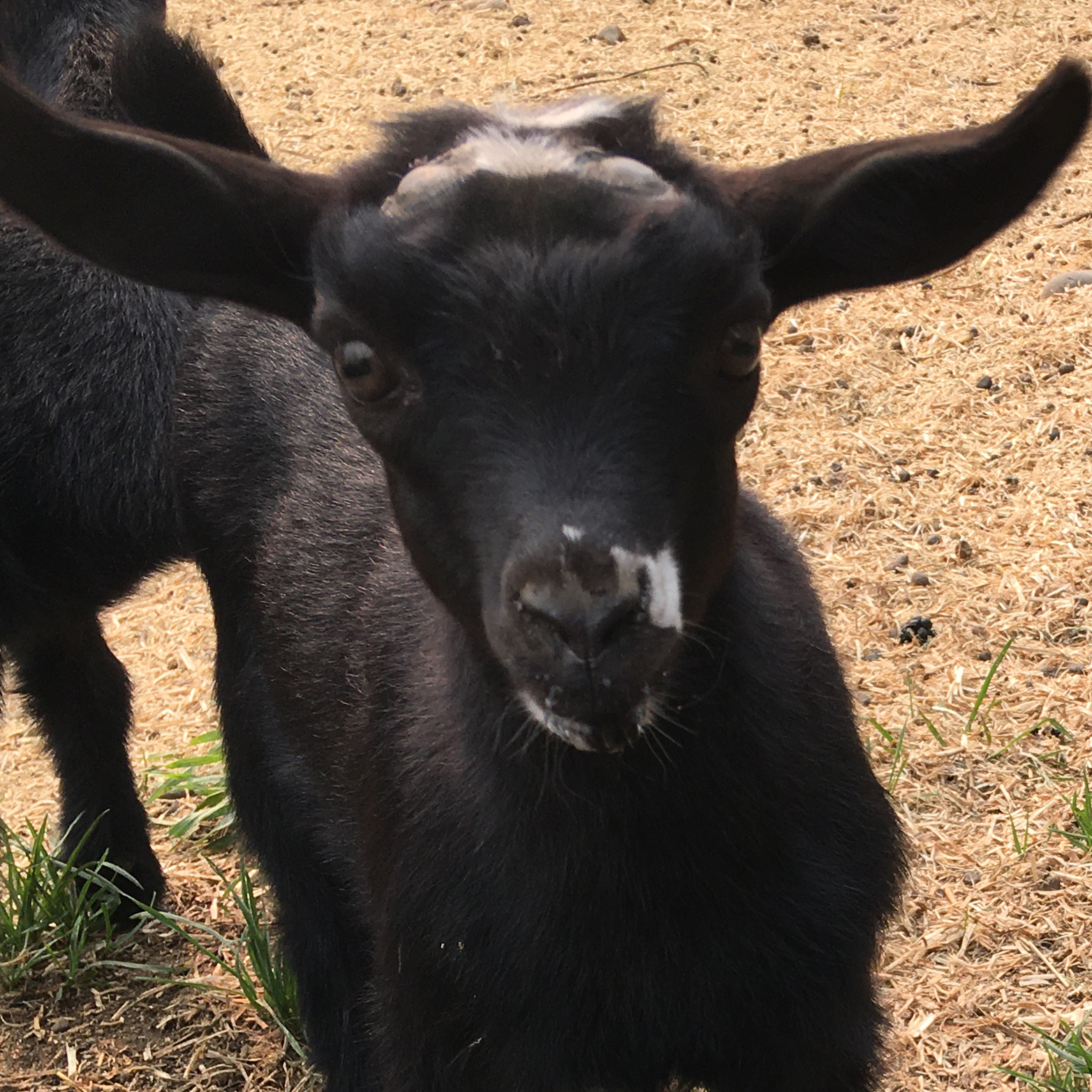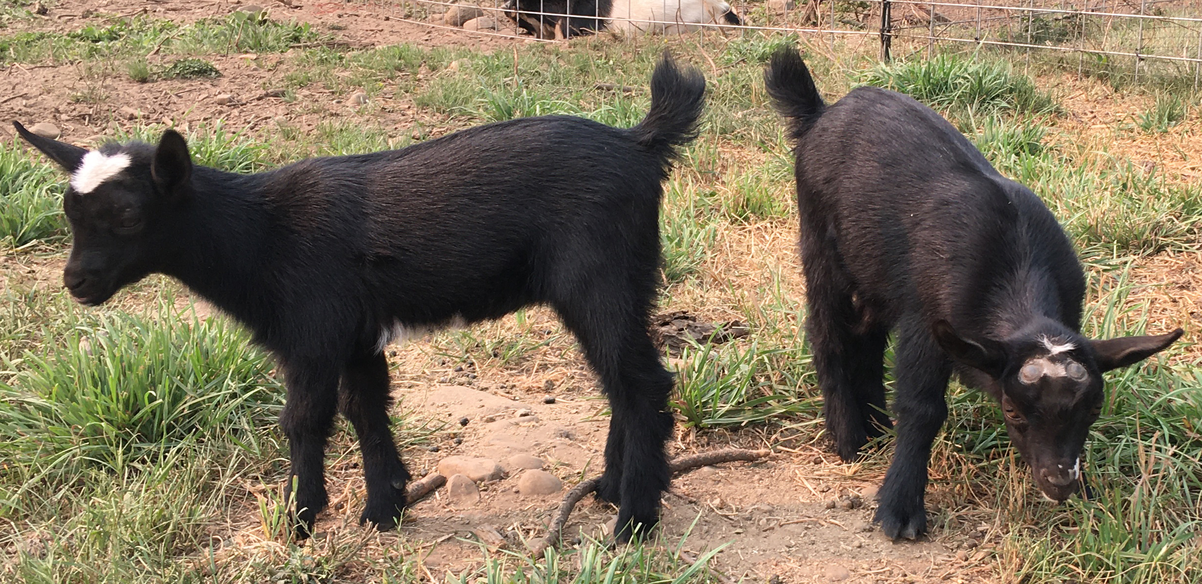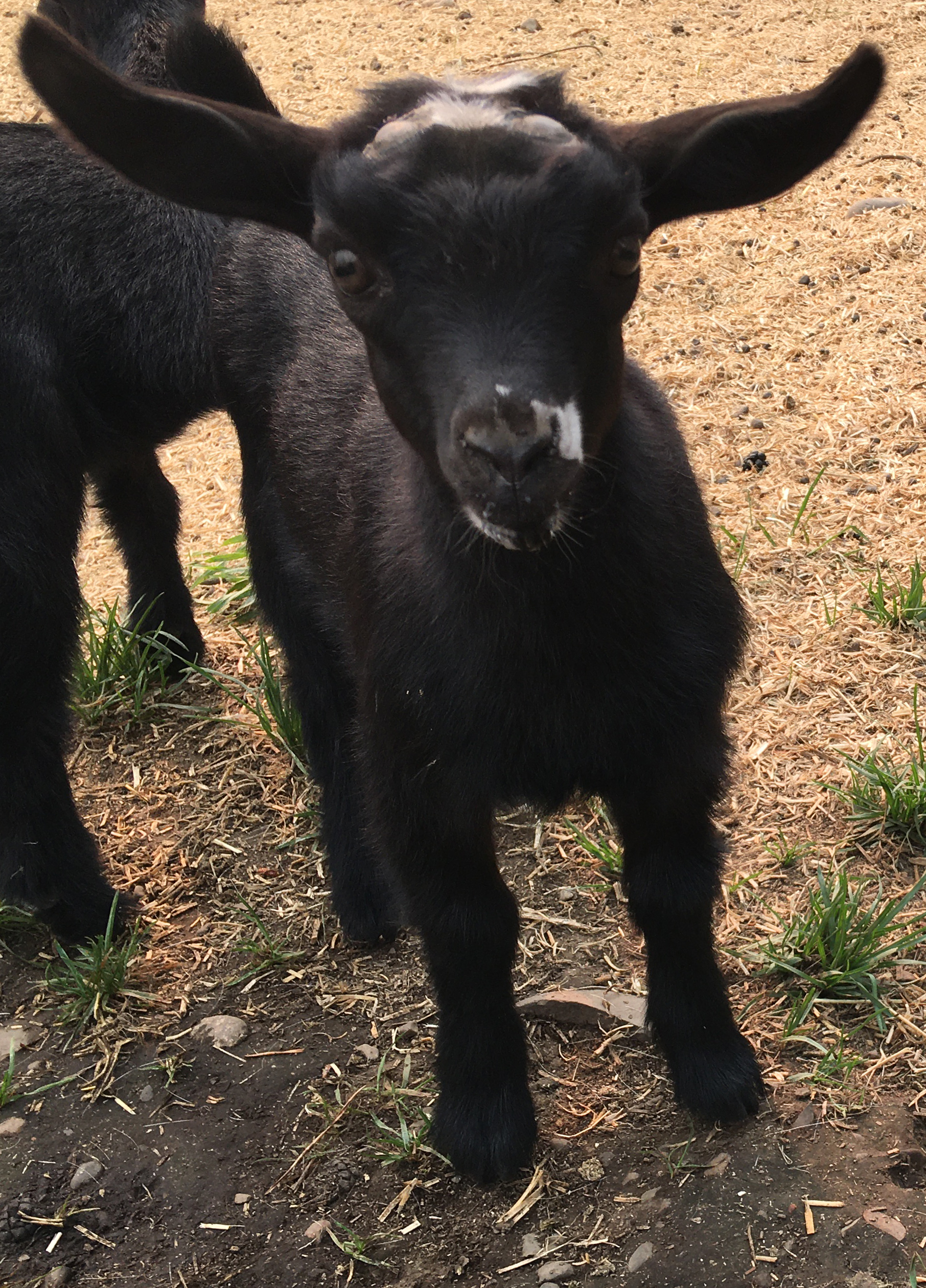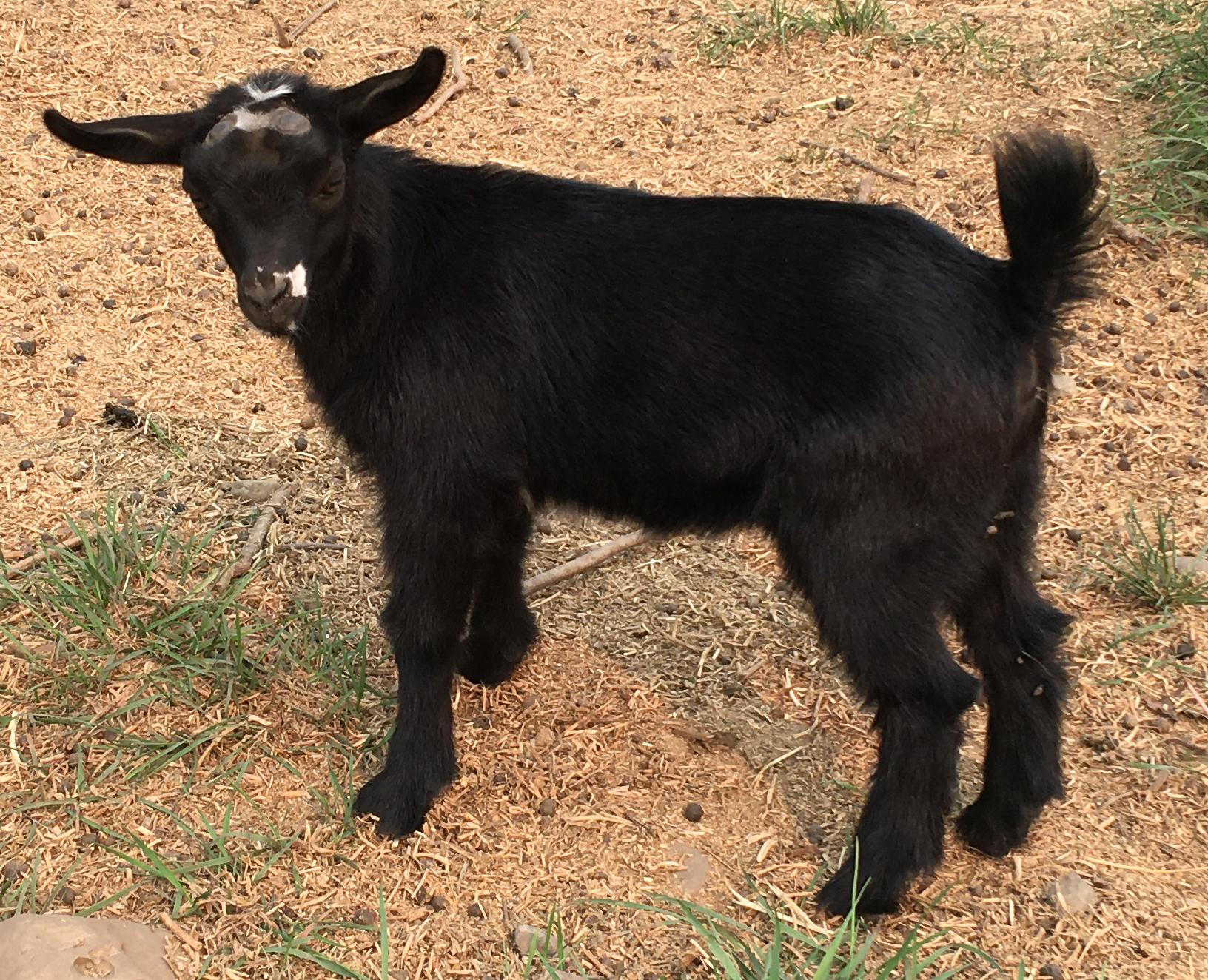 This little doeling doesn't look like much, but on a color genetics level, she is pretty rare. She is black, the most recessive coat type, she's brown eyed, which is recessive, and she was horned(disbudded) which is also a recessive trait. Now what purpose can all these recessives have? Well, they can suss out hidden traits in other goats. Is your goat really a red buckskin? Breed to a black goat and if you get chamoise and buckskin kids, you have your answer! Is your gold goat hiding the swiss-marked coat type under itself? Breed to black could let you know :)
