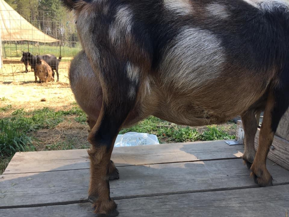 Moon kidded one buckling in June 2018, I finally got to assist with a birthing(everyone else managed without me). She let me assist again May 2019 with triplets, two with moonspots finally! I almost missed her third kidding, she had two wet bucklings and I KNEW she had more in there. I bumped her and it was a good learning experience to feel how a kid left inside felt. I must have irritated her enough that she finally got down to business and popped out the last buckling.